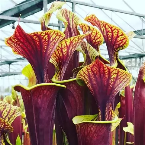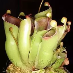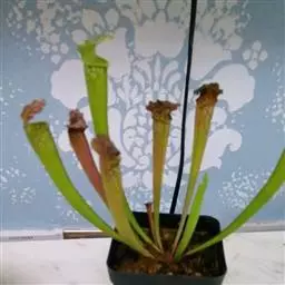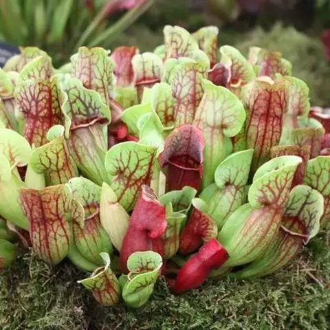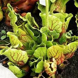 紫瓶子草(学名:Sarracenia purpurea)是多年生草本植物,也是瓶子草属的食虫植物里最矮小的品种,具有紫色的瓶子,瓶子很小,大约只有30厘米长,生长着偏向一侧的花朵,颜色鲜艳,亚种和变种很多。形态和猪笼草的笼子相似,能分泌蜜汁和消化液,受蜜汁引诱的昆虫失足掉落瓶中,瓶内的消化液会把昆虫消化吸收。生长范围几乎遍布美国东海岸、大湖区和加拿大东南部,成为最常见且广泛分布的瓶子植物。它也是唯一可以居住在冷温带的瓶子草属植物。