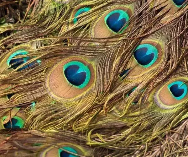 蓝孔雀羽片上缀有眼状斑,这种眼状斑是由紫、蓝、黄、红等构成。开屏时光彩夺目,尾羽上反光的蓝色的“眼睛”可以用来吓天敌。蓝孔雀还会抖动其尾羽,发出“沙沙”声。雌性蓝孔雀比较容易受“眼睛”多的雄鸟的吸引。雌性相对于雄鸟雌鸟比较小,很不显眼,其身长仅约1米,重2.7至4千克。羽色主要为灰褐,无尾屏,无距。幼孔雀的羽冠簇为棕色,颈部背面为深蓝绿色,羽毛松软,有时出现棕黄色。