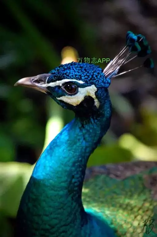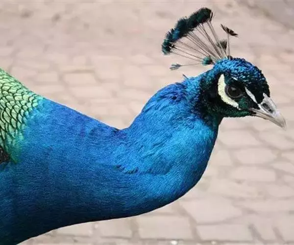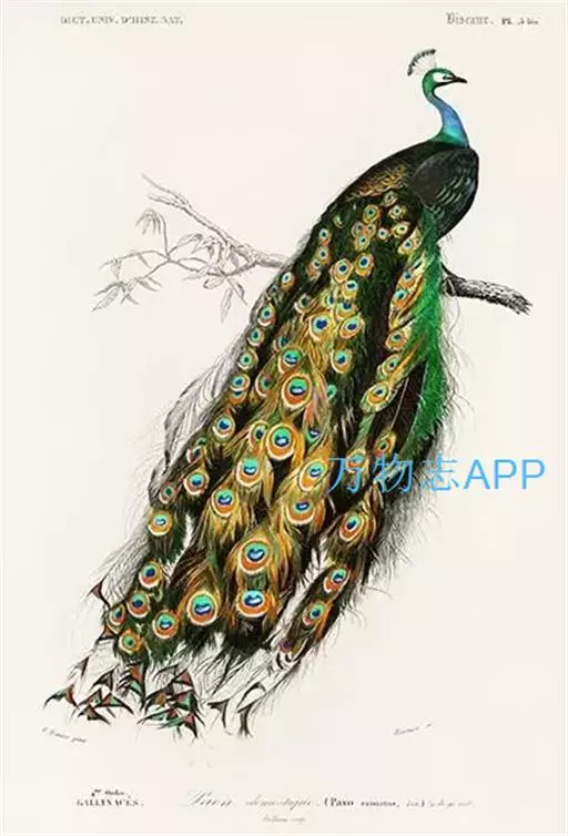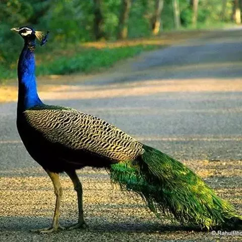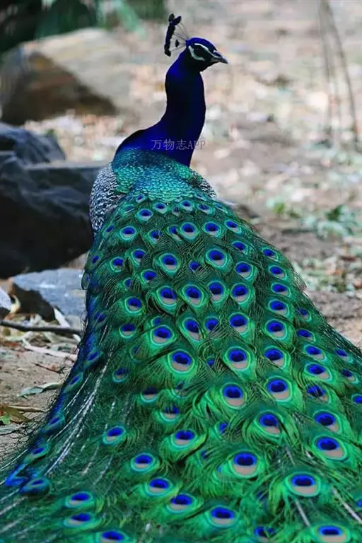 蓝孔雀(学名:Pavo cristatus):体长90-230厘米,翼展130-160厘米,体重4-6千克。雄鸟具直立的枕冠,羽色华丽,尾上覆羽特别延长,远超过尾羽。具20枚尾羽,形长而稍呈凸尾状;尾下覆羽为绒羽状;两翅稍圆,第1枚初级飞羽较第10枚短,第5 枚稍微最长;跗蹠长而强,远较中趾连爪为长,雄者具距。