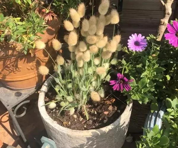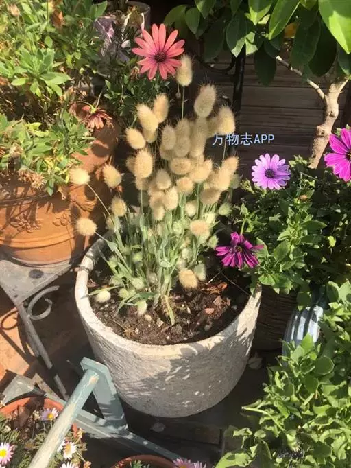 兔尾草(Lagurus ovatus L.)一般指禾本科兔尾草属 的一年生草本植物。丛生。圆锥花序,卵形,柔软,小穗多,花白色,雄蕊金黄色,初夏至秋季开放。叶长而窄,扁平。可快速自播繁殖。株高45cm,冠径15cm。极耐寒。