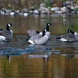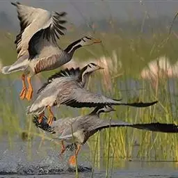 灰雁(学名:Anser anser):体长70-90厘米,翼展147-182厘米,体重2.5-4千克,寿命17年。体大而肥胖。嘴、脚肉色,上体灰褐色,下体污白色,飞行时双翼拍打用力,振翅频率高。脖子较长。腿位于身体的中心支点,行走自如。有扁平的喙,边缘锯齿状,有助于过滤食物。