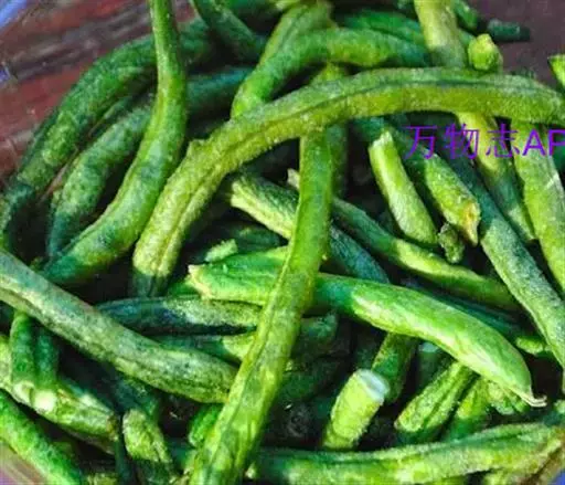 干品的收藏,用刚刚采摘的新鲜豇豆,经沸水煮至熟而不烂时捞出沥干,在太阳下晒干或用机械烤干;用时拿出经凉水浸泡至软备用,其味甘而鲜美,回味无穷。
