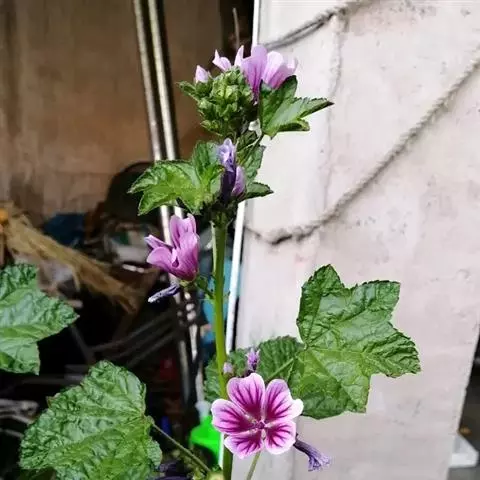二年生草本,高50-100厘米,茎干被星状长柔毛。叶肾形或圆形,直径5-11厘米,通常为掌状5-7裂,裂片三角形,具钝尖头,边缘具钝齿,两面被极疏糙伏毛或近无毛;叶柄长2-8厘米,近无毛,上面槽内被绒毛;托叶卵状披针形,被星状柔毛。花3-多朵簇生于叶腋,具极短柄至近无柄;小苞片3,线状披针形,长5-6毫米,被纤毛;萼杯状,直径5-8毫米,萼裂5,广三角形,疏被星状长硬毛;花冠长稍微超过萼片,淡白色至淡红色,花瓣5,长6-8毫米,先端凹入,爪无毛或具少数细毛;雄蕊柱长约4毫:米,被毛;花柱分枝10-11。果扁球形,径约5-7毫米;分果爿10-11,背面平滑,厚1毫米,两侧具网纹;种子肾形,径约1.5毫米,无毛,紫褐色。花期3-11月。