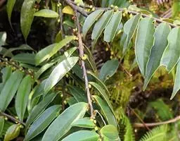 杨桐 灌木或小乔木,高2-10(-16)米,胸径10-20(-40)厘米,树皮灰褐色,枝圆筒形,小枝褐色,无毛,一年生新枝淡灰褐色,初时被灰褐色平伏短柔毛,后变无毛,顶芽被灰褐色平伏短柔毛。叶互生,革质,长圆状椭圆形,长4.5-9厘米,宽2-3厘米,顶端短渐尖或近钝形,稀可渐尖,基部楔形,边全缘,极少沿上半部疏生细锯齿,上面亮绿色,无毛,下面淡绿色或黄绿色,初时疏被平伏短柔毛,迅即脱落变无毛或几无毛;侧脉10-12对,两面隐约可见;叶柄长3-5毫米,疏被短柔毛或几无毛。