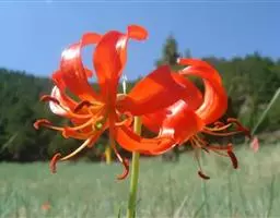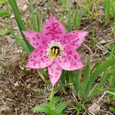 鳞茎卵状球形,高2.5-3厘米,直径2.3-2.5厘米,干时褐色,外层带黄色。茎高25-90厘米,无毛。叶在同一植株上兼具散生与轮生的,狭椭圆形或披针状椭圆形,长2.5-4.5厘米,宽0.7-1.5厘米。花单生,少有数朵,红色或粉红色;外轮花被片卵形,长2.5-3厘米,宽1.2-1.5厘米,几无斑点,全缘;内轮花被片宽卵形至卵圆形,长2.5-3厘米,宽2-2.5厘米,在里面有紫红色的斑点,基部有肉质的紫红色的垫状隆起,边缘有不整齐的锯齿;花丝下部呈肉质的圆筒状的膨大,紫红色或粉红色,长5-7毫米,上部丝状,白色,长2-2.5毫米;子房长5-7毫米,宽2-4毫米;花柱向上渐粗,长约8毫米,柱头头状,3浅裂。蒴果矩圆形,长2.5厘米,宽1.7厘米。花期5-6月,果期7月。鳞茎卵状球形,高2.5-3厘米,直径2.3-2.5厘米,干时褐色,外层带黄色。茎高25-90厘米,无毛。叶在同一植株上兼具散生与轮生的,狭椭圆形或披针状椭圆形,长2.5-4.5厘米,宽0.7-1.5厘米。花单生,少有数朵,红色或粉红色;外轮花被片卵形,长2.5-3厘米,宽1.2-1.5厘米,几无斑点,全缘;内轮花被片宽卵形至卵圆形,长2.5-3厘米,宽2-2.5厘米,在里面有紫红色的斑点,基部有肉质的紫红色的垫状隆起,边缘有不整齐的锯齿;花丝下部呈肉质的圆筒状的膨大,紫红色或粉红色,长5-7毫米,上部丝状,白色,长2-2.5毫米;子房长5-7毫米,宽2-4毫米;花柱向上渐粗,长约8毫米,柱头头状,3浅裂。蒴果矩圆形,长2.5厘米,宽1.7厘米。花期5-6月,果期7月。
