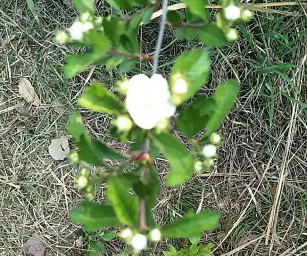 伞房花序,直径2-2.5厘米,具花5-7朵,总花梗和花梗均被柔毛。花梗长约1厘米;苞片草质,披针形,条裂或有锯齿,长8-12毫米,脱落很迟;花直径约1.5厘米;萼筒钟状,外被长柔毛,萼片三角卵形,长约4毫米,约与萼筒等长,先端尾状渐尖,全缘或有齿,内外两面均具柔毛;花瓣近圆形或倒卵形,长6-7毫米,白色,基部有短爪;雄蕊20;花药红色;花柱4-5,基部被绒毛。果实近球形或扁球形,直径1-1.2厘米,红色或黄色,常具有宿存反折萼片或1苞片;小核4-5,内面两侧平滑。花期5-6月,果期9-11月。