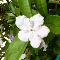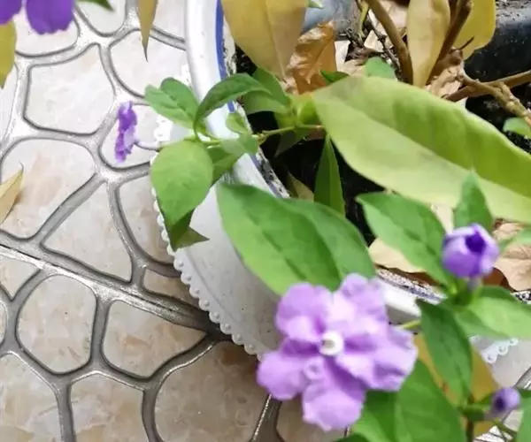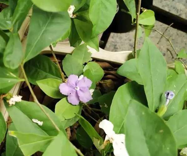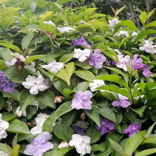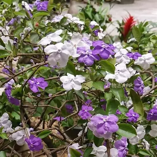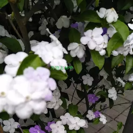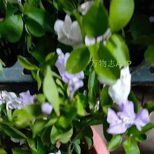 鸳鸯茉莉(Brunfelsia latifolia Benth.)属茄科鸳鸯茉莉属常绿矮灌木,是华北夏季露天摆放和冬季室内布置的优良盆栽花卉。鸳鸯茉莉高50至100厘米,单叶互生,花大多单生,少有数朵聚生的。花冠呈高脚碟状,有浅裂,花期4月至10月,单花开放5天左右。花朵初开为蓝紫色,渐变为雪青色,最后变为白色,由于花开有先后,在同株上能同时见到蓝紫色和白色的花,故又叫双色茉莉,其英文名之意为“昨天、今天、明天”,这形象地描绘出其花色的特殊变化。