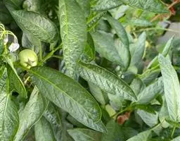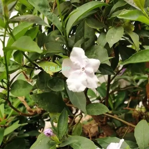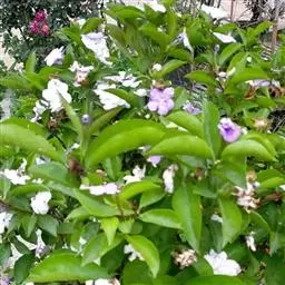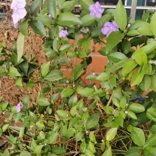 多年生常绿灌木,是华北夏季露天摆放和冬季室内布置 鸳鸯茉莉 的优良盆栽花卉。植株高约70~150厘米,盆栽经矮化后,株高可降低到30cm~60cm。茎皮成深褐色或灰白色,分枝力强,周皮纵裂。单叶互生,长披针形或椭圆形,先端渐尖,具短柄,口十面草绿色。叶长5~7厘米,宽1.7~2.5厘米,纸质,腹面绿色,背面黄绿色,叶缘略波皱。