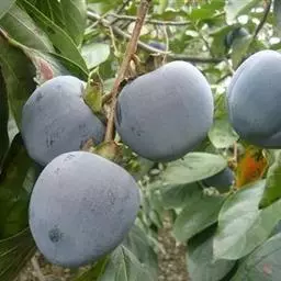 黑柿 原产中国,分布于山西省及山东省。1983年引入国家柿种质资源圃。果实中等大,平均重148克,最大果重180克。重台或心脏形,果面黑色。无纵沟,近蒂处有缢痕,赘肉呈肉座状。果实横断面圆形,果肉橙色,纤维细长中等多;软化后粘质,汁液较少,味浓甜,无核。髓小,成熟时空心,难脱涩,耐贮运,品质极上。糖度22%。最宜软食,也可制饼,柿饼外形整齐,肉质透亮、细腻,味甜。10月中旬成熟。该品种花、果均为黑色,非常罕见,糖度高,口感好,丰产,可做品质和观赏育种试材。
