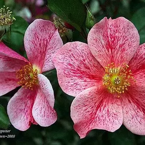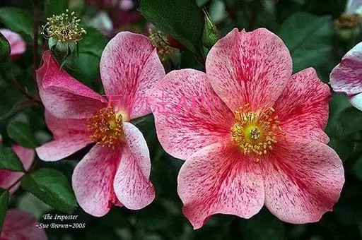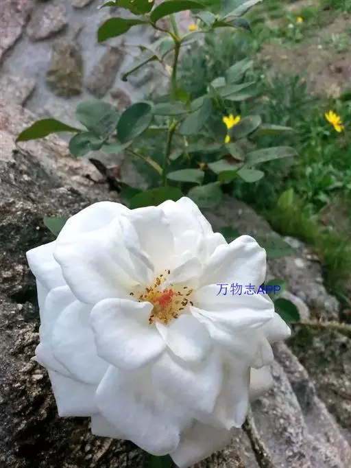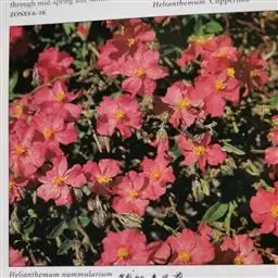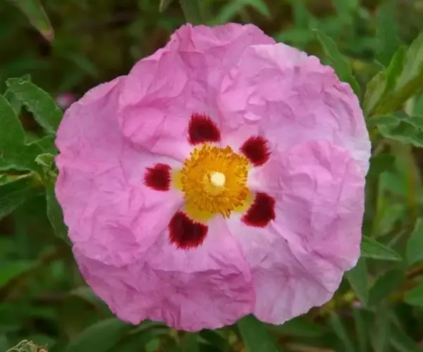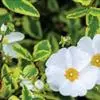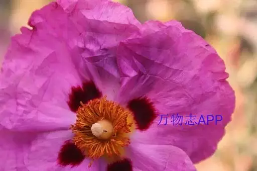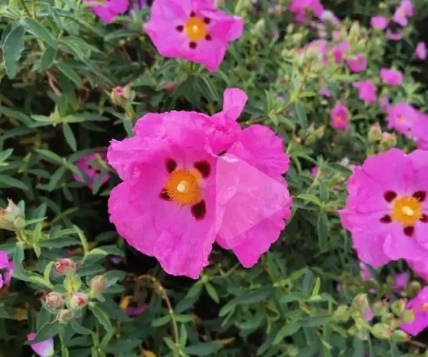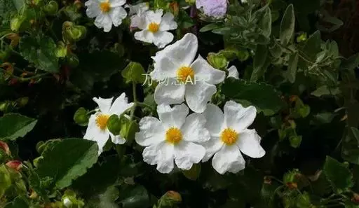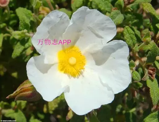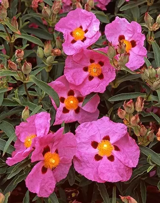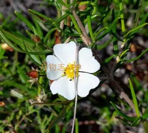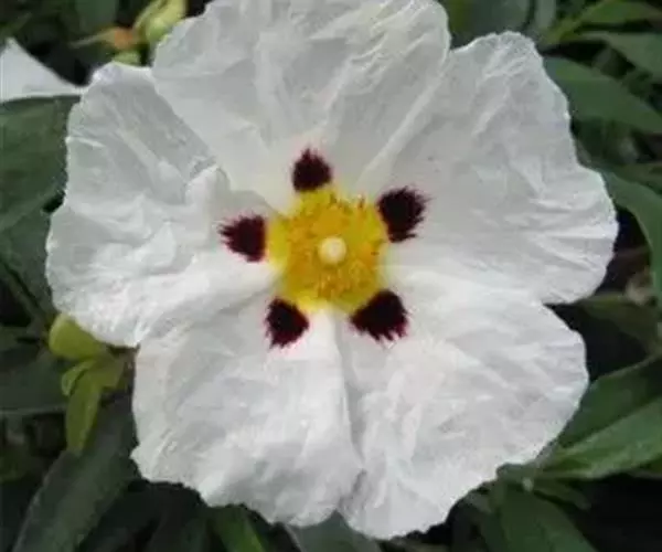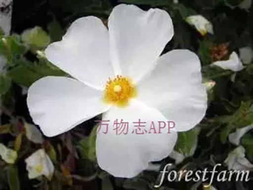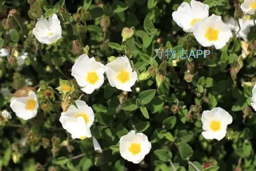 岩蔷薇,常绿灌木。直立。冠开张。叶窄,暗绿色,具黏性。花大而多,白色,花心雄蕊四周有红色斑,初夏开放。