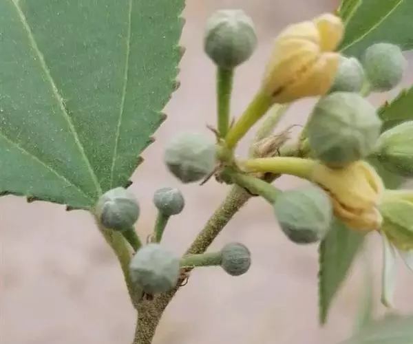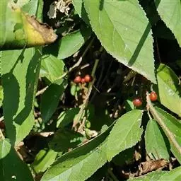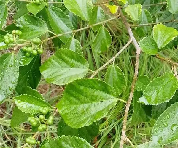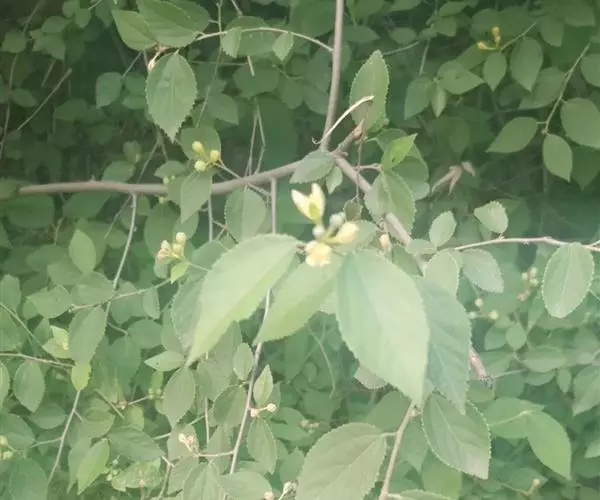 扁担杆 灌木或小乔木,高1-4米,多分枝;嫩枝被粗毛。叶薄革质,椭圆形或倒卵状椭圆形,长4-9厘米,宽2.5-4厘米,先端锐尖,基部楔形或钝,两面有稀疏星状粗毛,基出脉3条,两侧脉上行过半,中脉有侧脉3-5对,边缘有细锯齿;叶柄长4-8毫米,被粗毛;托叶钻形,长3-4毫米。聚伞花序腋生,多花,花序柄长不到1厘米;花柄长3-6毫米;苞片钻形,长3-5毫米;颧片狭长圆形,长4-7毫米,外面被毛,内面无毛;花瓣长1-1.5毫米;雌雄蕊柄长0.5毫米,有毛;雄蕊长2毫米;子房有毛,花柱与萼片平齐,柱头扩大,盘状,有浅裂。核果红色,有2-4颗分核。花期5-7月。