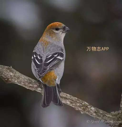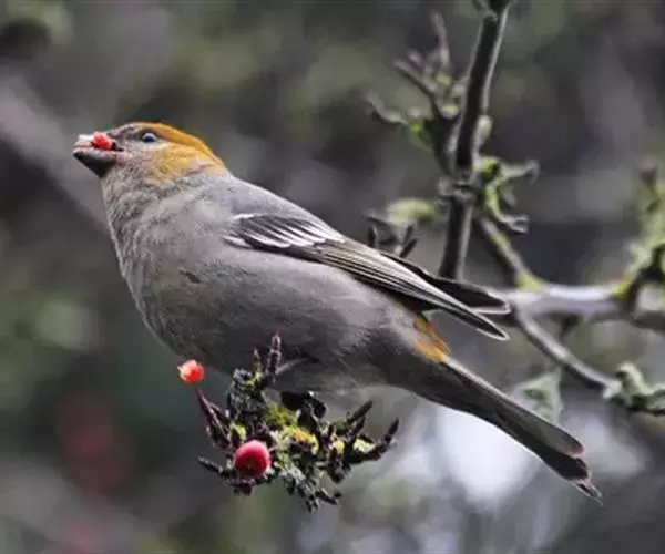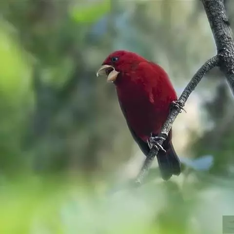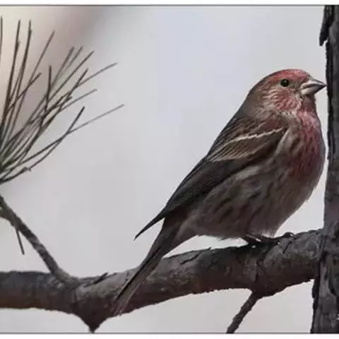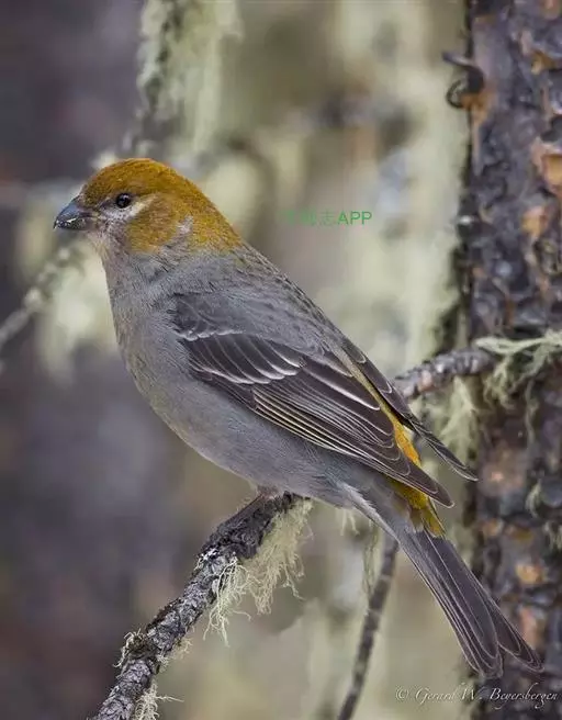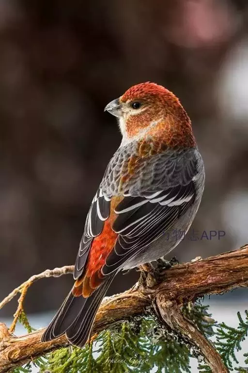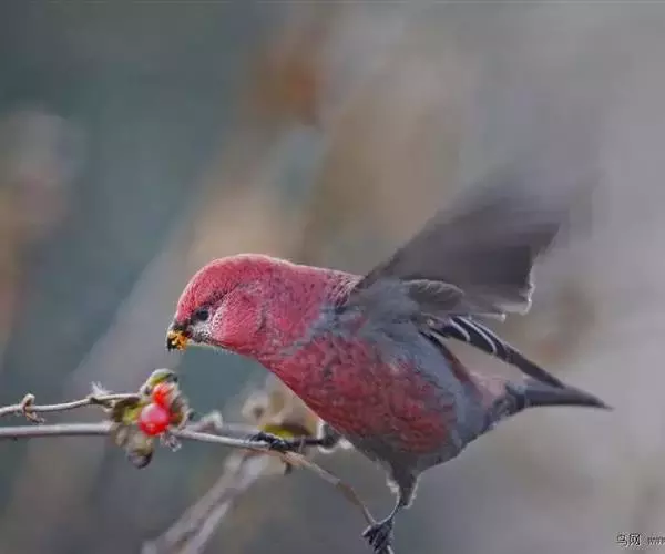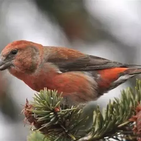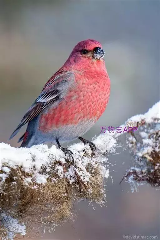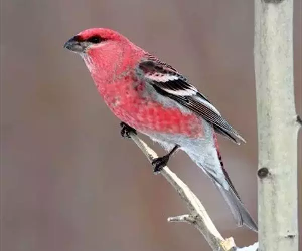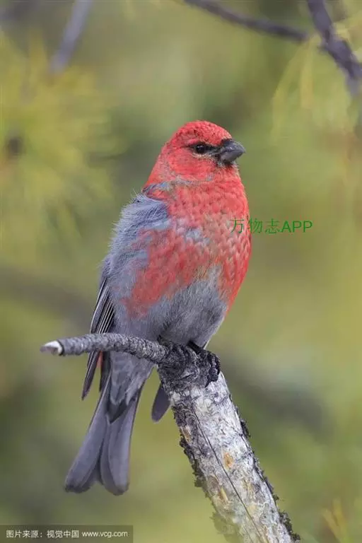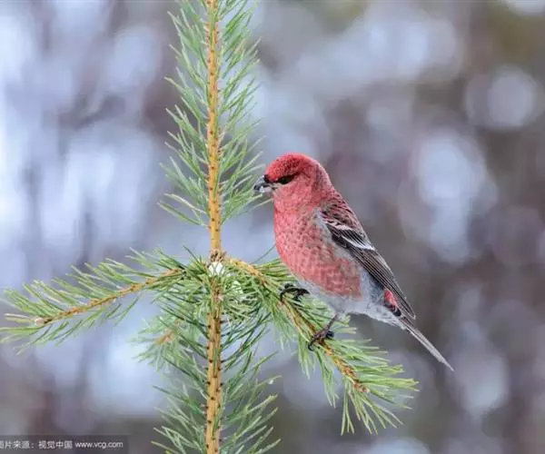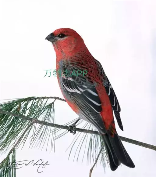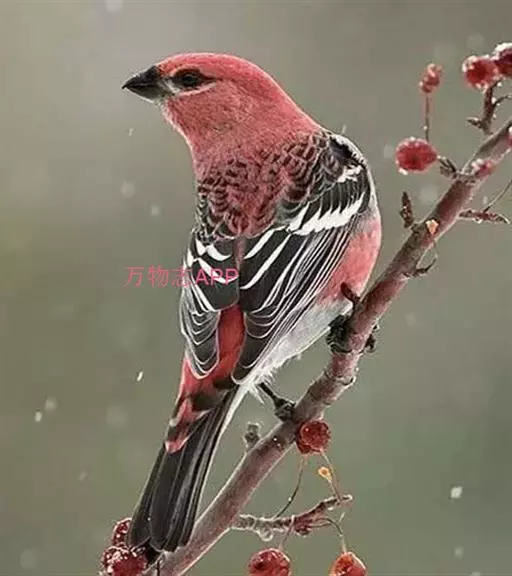 松雀(学名:Pinicola enucleator):体重48-57克,体长192-213毫米。是一种体型较大而尾长的雀。嘴厚而带钩,两道明显白色翼斑与近黑的翼成对比。成年雄鸟深粉红色,具别致的脸部灰色图纹。成年雌鸟似雄鸟但橄榄绿色取代粉红色。是一种非常漂亮的鸟,雄鸟呈红色,雌鸟呈绿色,两只鸟栖息于树枝上,红绿相映,十分有趣。幼鸟全身灰暗,具皮黄色的翼斑。与白翅交嘴雀雄雌两性的图纹相似,但嘴成钩状而非交叉,翼斑不如其显著,尾开叉较浅且色彩不显浓重。虹膜深褐色,嘴灰色,下嘴基粉红,脚深褐色。