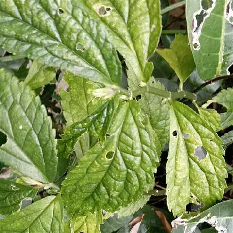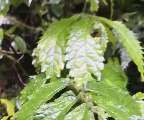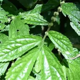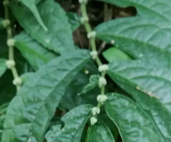 叶无柄或近无柄;叶片草质,斜倒披针状长圆形或斜长圆形,有时稍镰状弯曲,长4.5-16(-19)厘米,宽2.2-4.5(-6)厘米,顶端骤尖(骤尖部分全缘),基部在狭侧楔形,在宽侧圆形或浅心形,边缘在基部之上有较多牙齿,上面有少数短糙伏毛,下面无毛或沿脉有短毛,钟乳体明显,密,长0.3-0.4毫米,叶脉羽状,侧脉每侧5-8条;托叶狭条形或狭三角形,长3-5毫米,无毛。
