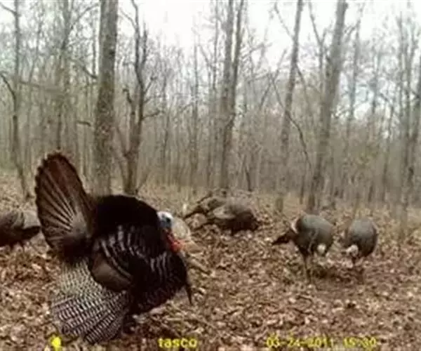 火鸡求偶时,雄鸟展开尾羽,翅膀下垂,抖动羽翈作声,缩头阔步行走,并发出急促的“咯咯”叫声。早春繁殖。筑巢在地面上。一只雄鸟配一群雌鸟,每窝产8-15枚淡褐色有斑点的卵,卵产在地面低洼处;孵化期28天。