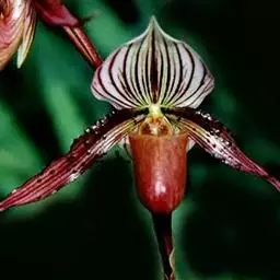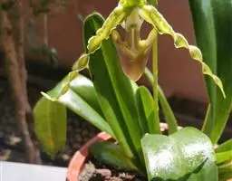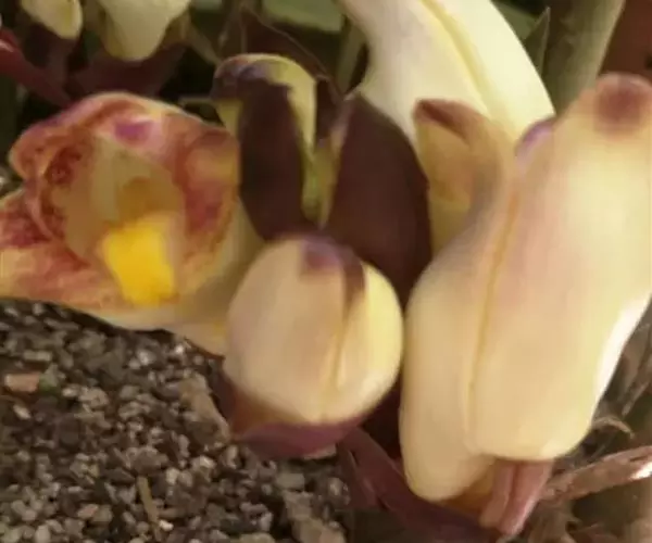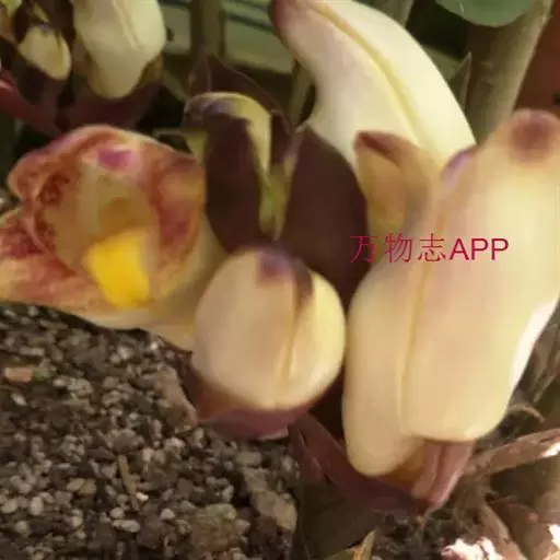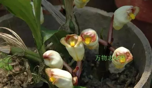 花葶肉质而肥厚,长15-20厘米,基部具数枚宽卵状披针形的鳞片状鞘;总状花序具3-4朵花;花苞片深茄紫色,凹陷,卵形或长圆形,长2-2.5厘米,先端急尖;花梗和子房浅茄紫色,长3-4厘米;花白色或稻草黄色,内面在中部以上具紫褐色斑点;中萼片近椭圆形,长2-2.5厘米,宽1厘米,上部外折,先端钝,具7条脉,侧萼片斜三角形或镰刀状长圆形,比中萼片长,上部外折,先端钝,基部歪斜而贴生在蕊柱足上,具7条脉;萼囊短而宽钝。