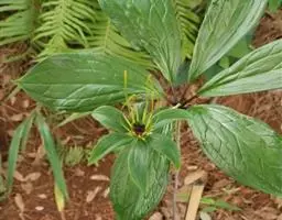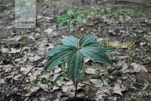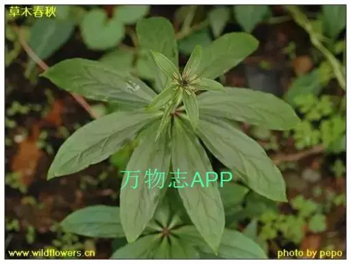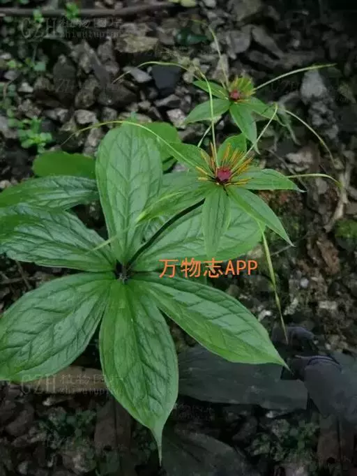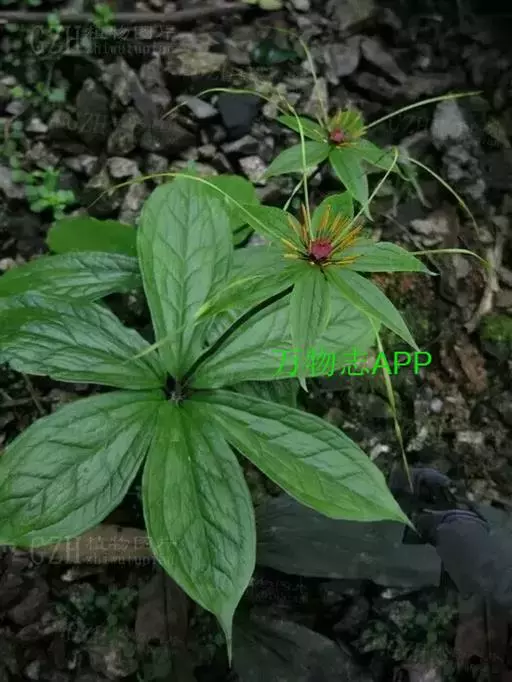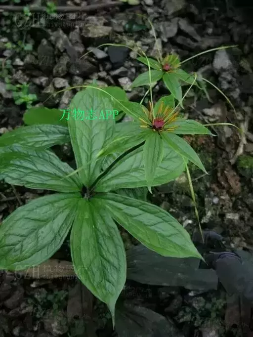 ① 七叶一枝花(《本草蒙筌》) 多年生直立草本,全体光滑无毛,高30~100厘米。根茎肥厚,黄褐色,结节明显,具鳞片状叶及众多须根。茎单一,青紫色或紫红色,直径约1厘米,基部有膜质叶鞘包茎。叶轮生茎顶,4~9片,通常为7片,长椭圆形或椭圆状披针形,长9~23厘米,宽2.5~7厘米,先端渐尖或短尖,全缘,基部楔形,膜质或薄纸质,绿色,有时下面带紫色;主脉3条基出。花单生顶端,花梗青紫色或紫红色;外列被片绿色,叶状,4~7片,长卵形至卵状披针形,长3~5厘米,宽1~1.5厘米,先端渐尖;内列被片与外列同数,黄色或黄绿色,线形,宽约1毫米,一般短于外列被片:雄蕊数与花被片同,花丝扁平,长3~5毫米,花药线形,金黄色,纵裂,长于花丝2~3倍,药隔在药上略延长、或无;子房上位,具4~6棱,花柱短,先端4~7裂,向外反卷;胚珠每室多数。蒴果球形,熟时黄褐色,3~6瓣裂,直径2~2.4厘米,内含多数鲜红色卵形种子。花期4~7月。果期8~11月。
