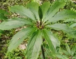 ② 金钱重楼(《本草蒙筌》) 多年生草本,高约60厘米。根茎横生,肥大,表面粗糙,节明显,每节上有纤维状须根,断面粉质。茎由根茎顶端生出,单一,圆柱形,基部带紫色。叶5~11片,一般为7片,轮生于茎顶,叶片长圆形或倒披针形,长7~15厘米,宽3~5厘米,叶柄常带红色。夏季茎顶抽出花梗,顶生花一朵;外轮花被片4~6片,卵状披针形,内轮花被片线形,与外轮花被片同数,长于外轮花被片;雄蕊亦与花被片同数,淡黄色;花柱4~5,子房8~10室。浆果状蒴果近球形,有角棱,成熟时带紫色。花期6~7月。果期8~10月。生于山区林下或山谷、溪涧边阴湿处。分布云南、广东、湖北、四川、陕西、安徽、江苏等地。此外,尚有下列几种同属植物,亦同等入药:①阔瓣蚤休叶6~8片,倒卵形或倒卵状披针形。花的外列被片绿色,4~5瓣,内列被片黄色,4~5瓣,线形而略呈披针状,中上部宽2~3毫米;花柱4~5短裂。