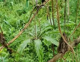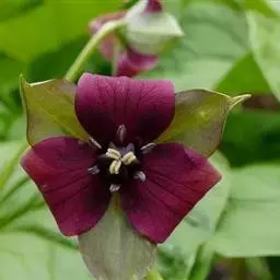 ⑤ 滇王孙,又名:金沙重楼多年生草本,高30~50厘米。叶6~9片,长椭圆形至椭圆状披针形,长6~10厘米,宽1.5~2.5厘米。花柄短于叶片,长2~7厘米;外列被片4~5瓣,披针形,长2~3厘米,宽约5毫米,内列被片4~5瓣,狭线形,长约1厘米,暗紫色;雄蕊6~10,赤紫色,花药线形,药隔暗褐色,于花药顶端延伸约3毫米;子房有时具翼,花柱4或5枚。花期5~6月。分布云南、四川。