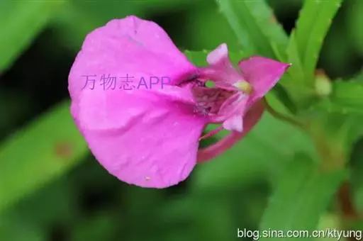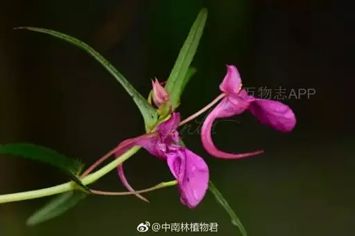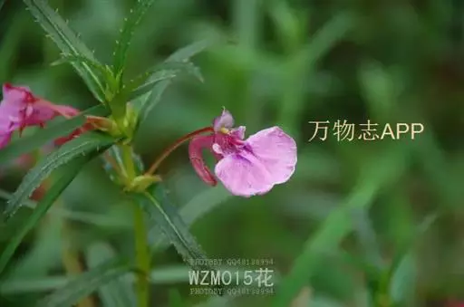 华凤仙(学名:Impatiens chinensis Linn.):凤仙花科,凤仙花属一年生草本植物,高可达60厘米。茎纤细,无毛,叶对生,叶片硬纸质,稀倒卵形,上面绿色,被微糙毛,下面灰绿色,无毛,花较大,1-3朵簇生于叶腋,紫红色或白色;苞片线形,唇瓣漏斗状,旗瓣圆形,翼瓣无柄,花丝线形,花药卵球形,子房纺锤形,蒴果椭圆形,种子黑色圆球形有光泽。