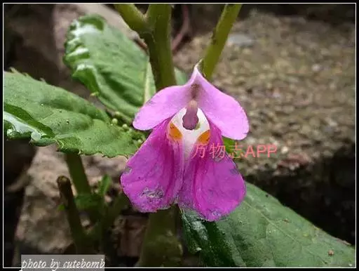 花较大,单生或2-3朵簇生于叶腋,无总花梗,紫红色或白色;花梗细,长2-4厘米,一侧常被硬糙毛;苞片线形,位于花梗的基部;侧生萼片2,线形,长约10毫米,宽约1毫米,先端尖,唇瓣漏斗状,长约15毫米,具条纹,基部渐狭成内弯或旋卷的长距;旗瓣圆形,直径约10毫米,先端微凹,背面中肋具狭翅,顶端具小尖,翼瓣无柄,长14-15毫米,2裂,下部裂片小,近圆形,上部裂片宽倒卵形至斧形,先端圆钝,外缘近基部具小耳;雄蕊5,花丝线形,扁,花药卵球形,顶端钝;子房纺锤形,直立,稍尖。