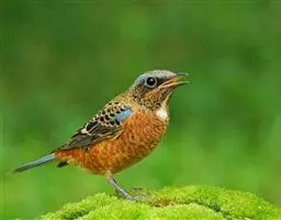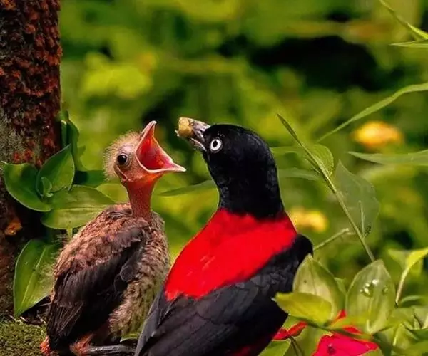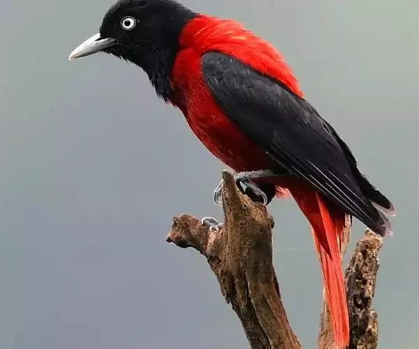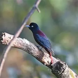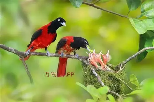 朱鹂(学名:Oriolus traillii):中等鸟类,体长23-28厘米。雄鸟绛紫红色,头、上胸及翼黑色。雌鸟上背及背部深灰色,尾覆羽及尾绛紫红色,腹部及下胸白而密布黑色纵纹。与鹊色鹂幼鸟的区别在上背灰色较深,下体白色较少且纵纹较粗。幼鸟比雌鸟色浅,喉显白。虹膜黄色;嘴蓝灰;脚灰色。
