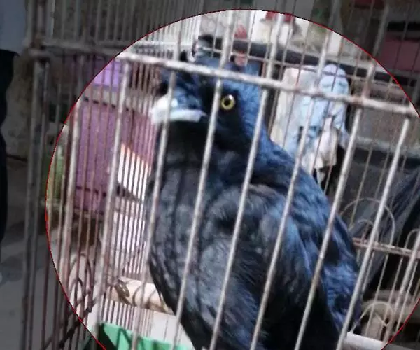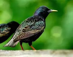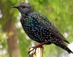 体长约25厘米。嘴形尖而较直,呈乳黄色,虹膜橙黄色。额羽耸立于嘴基上,有如冠状。通体几乎纯黑色;头顶、颊、枕及耳羽具绿色的金属光泽,各羽呈矛状;上体余部不如头部之辉亮,而缀以褐色。翅圆,初级覆羽先端和初级飞羽的基部均白色,形成明显的白色翼斑,飞时显露,呈"八"字形。尾短呈平尾状,尾羽绒黑色;除中央尾羽外,均具白色羽端。下体呈幽暗的灰黑色,肛周呈浅灰或褐灰色;尾下覆羽黑色,尾羽末端白色。脚长而健,跗跖黄色。雄鸟普鸣,笼养训练,能效人言。