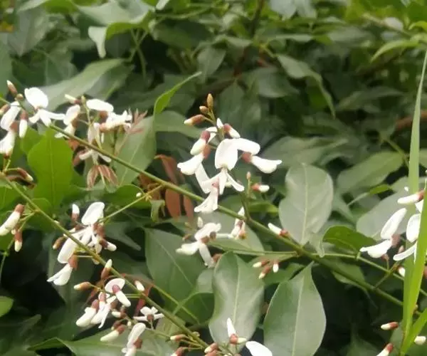 圆锥花序腋生,稍短于复叶;花序轴和花梗有极稀少的黄褐色短硬毛;花数朵生于短小枝上,花梗通常长3-5毫米;小苞片2,长约1毫米,生于花萼的基部,外被微柔毛;花萼钟状,长2-3毫米,上部被极稀疏的柔毛,萼齿短,圆形或三角形;花冠白色,长约10毫米,旗瓣阔倒卵状椭圆形,有短柄,翼瓣一侧有耳,龙骨瓣基部具尖耳;雄蕊单体;子房无柄,被白色长柔毛。