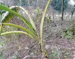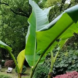 红蕉,假茎高1-2米。叶片长圆形,长1.8-2.2米,宽68-80厘米,叶面黄绿色,叶背淡黄绿色,…