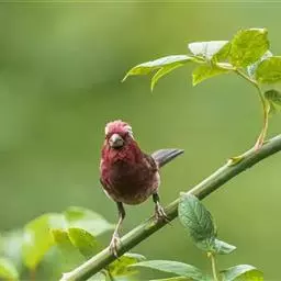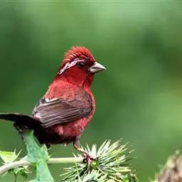 酒红朱雀小型鸟类,体长13~15厘米。雄鸟通体深红色,头部深朱红或棕红色,下背和腰玫瑰红色,…
