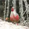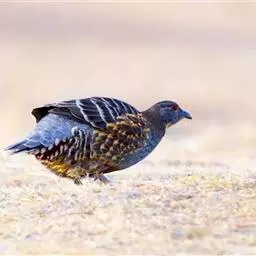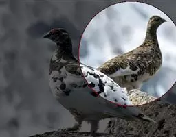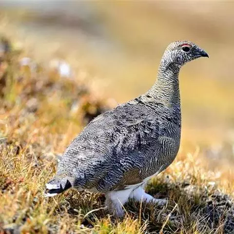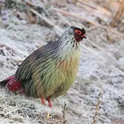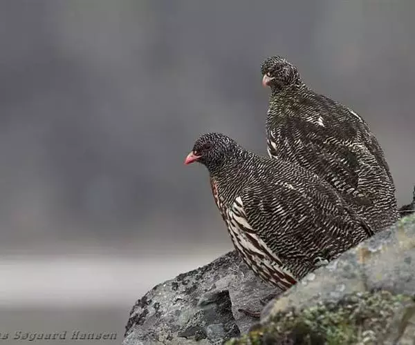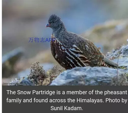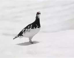 雪鹑(学名:Lerwa lerwa):雄鸟的体长为364毫米,体重560-650克;雌鸟体长310-367毫米,体重420-650克。体羽大都呈黑色与白色,或者黑色与棕色相杂的横斑;飞羽为黑褐色;胸、腹栗色,羽缘具有白斑;尾部有宽度几乎相等的黑白相间的横斑。好像是为了弥补体羽上鲜艳色彩的欠缺,眼睛的虹膜为血红色,嘴和脚更是具有光泽的珊瑚红色。