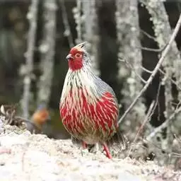 血雉雉科血雉属鸟类,别名血鸡、松花鸡,血雉的雄鸟大覆羽、尾下覆羽、尾上覆羽、脚、头侧、腊膜为红色,…