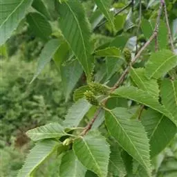 乔木,高6-20米;树皮黑褐色,龟裂;枝条红褐色或暗褐色,光亮,无毛;小枝红褐色, 疏被长柔毛,密生树脂腺体。叶厚纸质,通常为长卵形,间有宽卵形、卵形、菱状卵形或椭 圆形,长4-8厘米,宽3.5-5厘米,顶端锐尖或渐尖,基部近圆形、宽楔形或楔形,边缘具 不规则的锐尖重锯齿,上面无毛,下面密生腺点,沿脉疏被长柔毛,脉腋间具簇生的髯毛, 侧脉6-8对;叶柄长约5-15毫米,疏被长柔毛或近无毛。果序矩圆状圆柱形,单生,直 立或微下垂,长2-2.5厘米,直径约l厘米;序梗长约5-12毫米,疏被长柔毛或几无毛, 有时具树脂腺体;果苞长约5.-T6毫米,背面无毛,边缘具纤毛,基部宽楔形,上部三裂,中裂片矩圆形或披针形,顶端钝,侧裂片卵形或宽卵形,斜展,横展至下弯,比中裂片宽,与之等长或稍短。小坚果宽椭圆形,两面无毛,膜质翅宽约为果的1/2。
