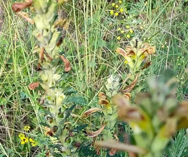 花序穗状,伸长,稠密,偶然下部的花疏远,或在结果时稍疏,长6-22厘米,轴被密毛;苞片三角形,或披针形,下部者多少叶状而有齿,上部者全缘,短于花,无毛或被卷曲缘毛;萼钟形,长10-13毫米,薄革质,被疏毛,齿5枚,不相等,后方一枚较短,三角形,侧生者两两结合成端有2裂的大齿,缘有卷曲之毛;花冠黄色,具绛红色的脉纹,长25-33毫米,管在喉部以下向右扭旋,使花冠稍稍偏向右方,其长红等于盔,盔强大,向端作镰形弯曲,端部下缘具2齿,下唇不很张开,稍短于盔,3浅裂,侧裂斜肾脏形,中裂宽过于长,迭置于侧裂片之下;花丝有一对被毛。