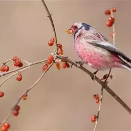 北朱雀,是燕雀科朱雀属鸟类。雄鸟额和头顶前部珠白色具窄的粉红色羽缘,…