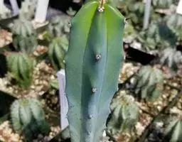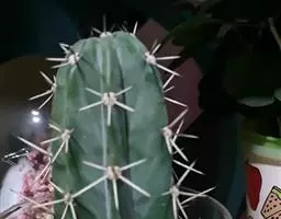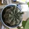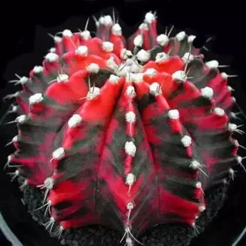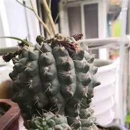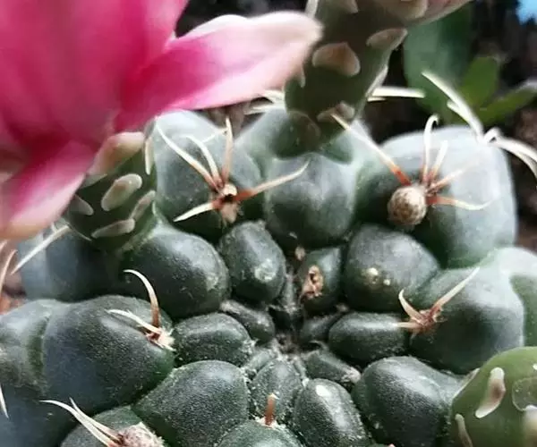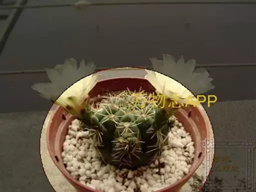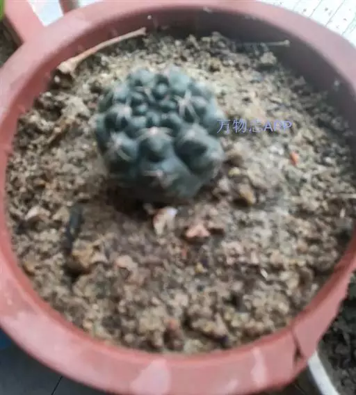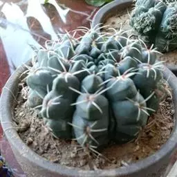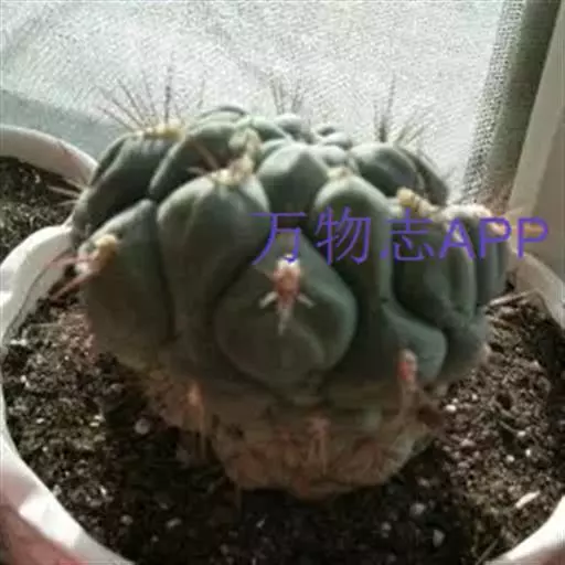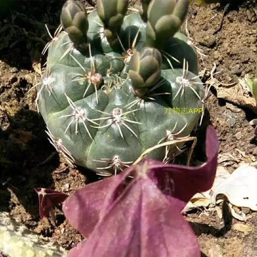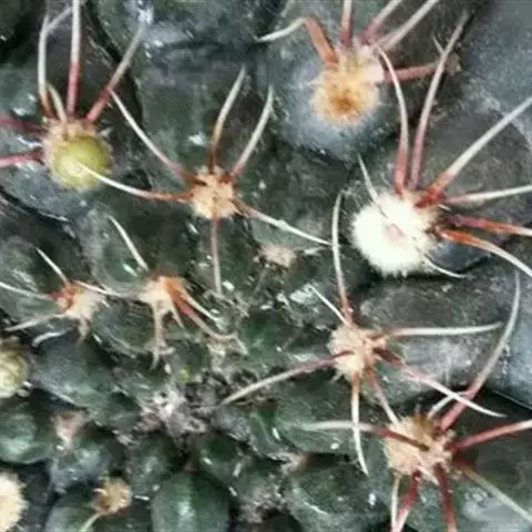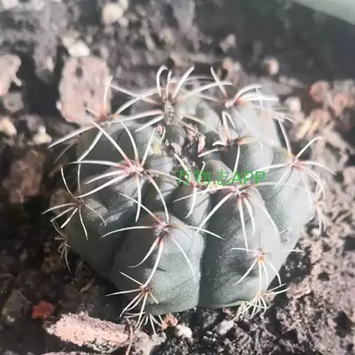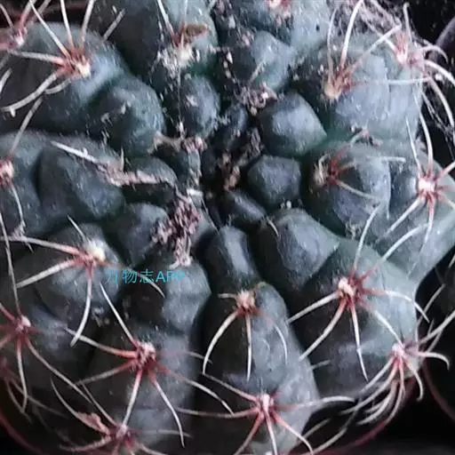 多肉植物,植株呈扁球形,直径7厘米,表皮墨绿色,具棱7-11。刺针状,每个刺座有5枚灰色周刺,中刺1枚,稍粗,灰白或褐色,最长可达1.5厘米。