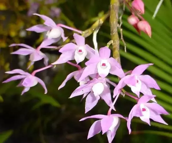 重唇石斛(学名:Dendrobium hercoglossum Rchb. f.):茎下垂,圆柱形或有时从基部上方逐渐变粗,具少数至多数节。叶薄革质,狭长圆形或长圆状披针形。总状花序通常数个,从落了叶的老茎上发出,常具2-3朵花;花开展,萼片和花瓣淡粉红色;花瓣倒卵状长圆形,长1.2-1.5厘米,宽4.5-7毫米,先端锐尖,具3条脉;唇瓣白色,直立,长约1厘米,分前后唇;后唇半球形,前端密生短流苏,内面密生短毛;前唇淡粉红色,较小,三角形,先端急尖,无毛。花期5-6月。