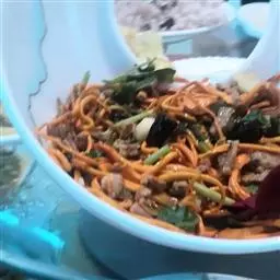 2、炒锅置旺火上,放入混合油烧至五成熟,将肉丝用酱油、水豆粉拦匀下锅,炒至肉散至发白。即下榨菜丝、葱丝一起炒匀,放入少许汤炒转起锅即成。