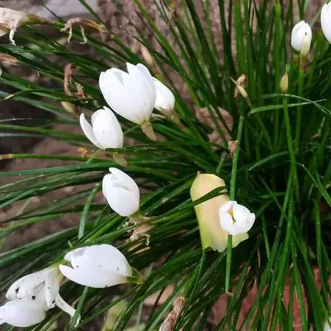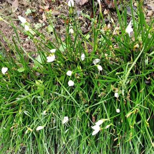 葱莲(学名:Zephyranthes candida (Lindl.)Herb.),又名玉帘、葱兰等,多年生草本植物,鳞茎卵形,直径约2.5厘米,具有明显的颈部,颈长2.5-5厘米。叶狭线形,肥厚,亮绿色,长20-30厘米,宽 2-4毫米。