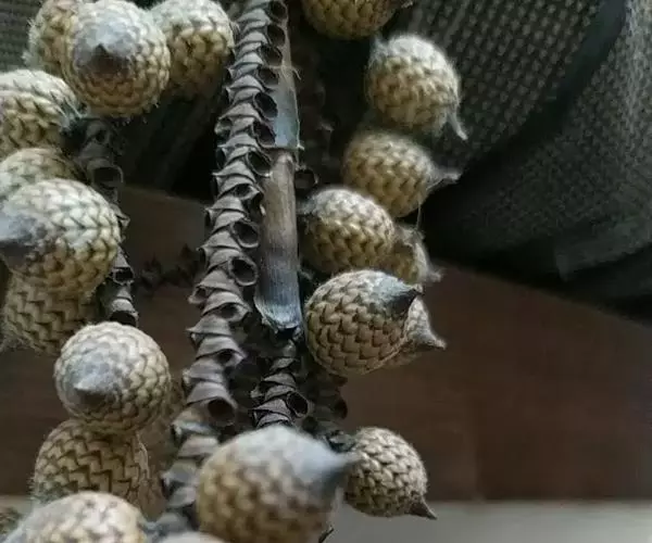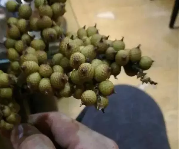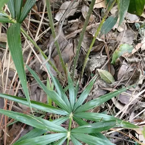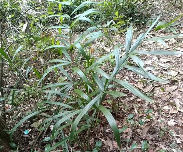无茎,丛生,高2-3米。叶羽状全裂,长0.8-1.6米,顶端不具纤鞭;羽片多数,两面黄绿色,每2-6片成组聚生于叶轴两侧,并指向不同方向,剑形,先端渐尖,长30-37厘米,宽1.5-2厘米,上部的渐变小;3条叶脉上及边缘疏被微刺;叶轴背面具稍短的单生的爪状刺;叶柄下部近圆柱形,上部三棱形,疏被强壮的带黑尖的直刺;叶鞘非筒状并渐延伸为叶柄,不具囊状凸起。雄花序为部分三回分枝,长约50厘米,约有6个分枝花序,长约15厘米;一级佛焰苞为薄片状苞片,撕裂成纤维状,长度超过分枝花序约1倍;二级佛焰苞亦成纤维状,一、二级佛焰苞上无刺,被淡褐色鳞秕;小穗状花序长3-4厘米,每侧有花12-15朵;雄花长4.5厘米,花萼杯状,长2.5毫米,顶端裂成3个三角形的尖头,具条纹脉,花冠裂片长于花萼的2倍,具条纹脉;雌花序顶端不具纤鞭,二回分枝,约有6个下弯的分枝花序,长约20厘米;一级佛焰苞如雄花序的;小穗状花序长约7.5厘米,小穗轴四棱状,上面着生密集的花;小佛焰苞短管状漏斗形,一侧延伸为三角形急尖的尖头。果被梗状,果实阔卵状椭圆形,长15毫米,具短的圆锥状的喙,鳞片18-21纵列,中央无沟槽,淡红黄色,向顶端变为淡红褐色,边缘具细的流苏状的纤毛。种子椭圆形,稍扁,背面略有小瘤状突起,种脊面有深的合点孔穴,胚乳均匀,胚基生。花期6-7月,果期9-10月。