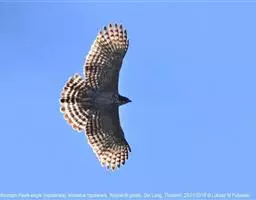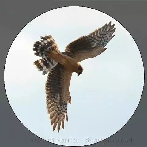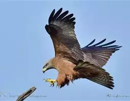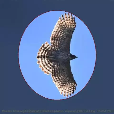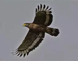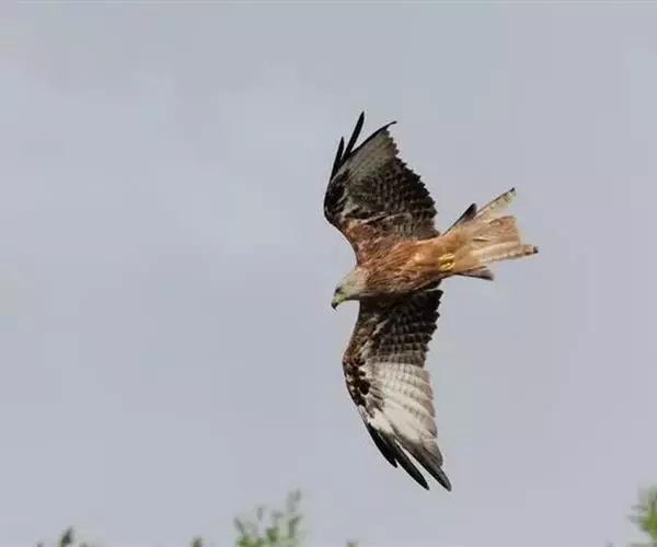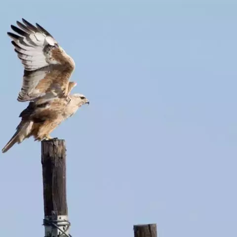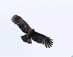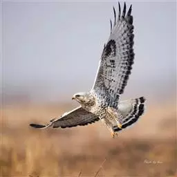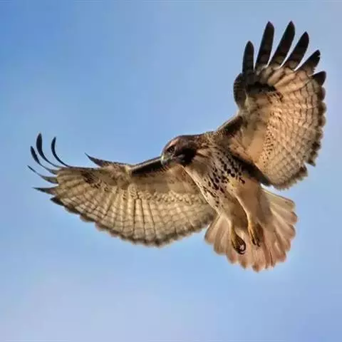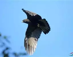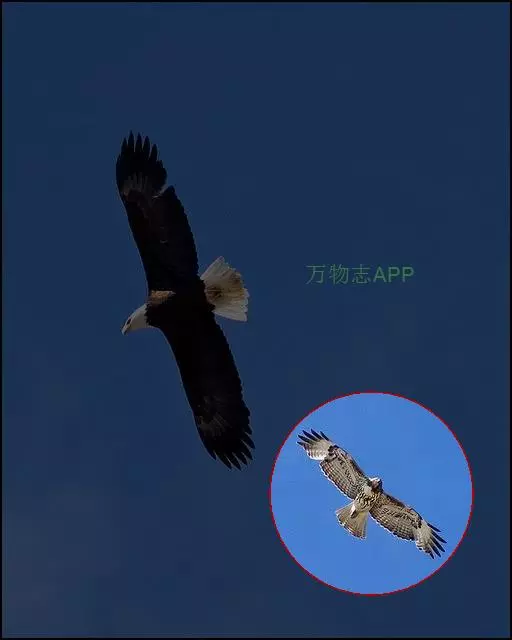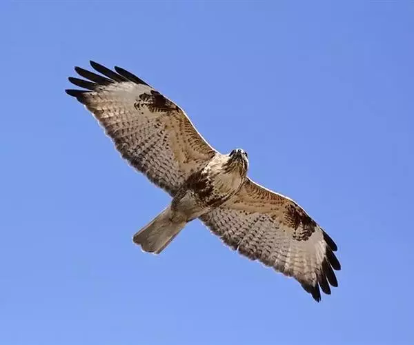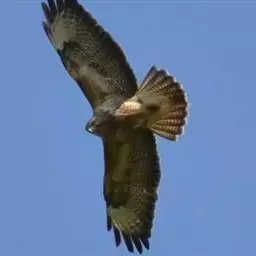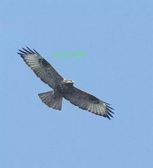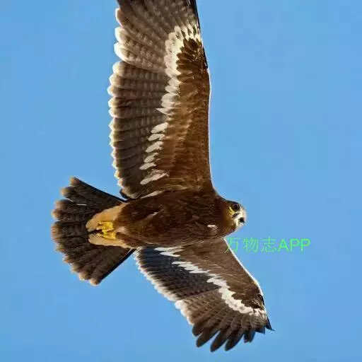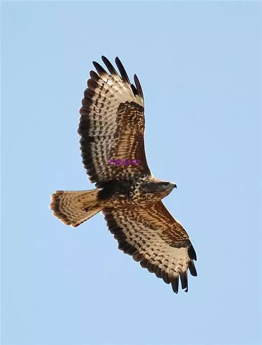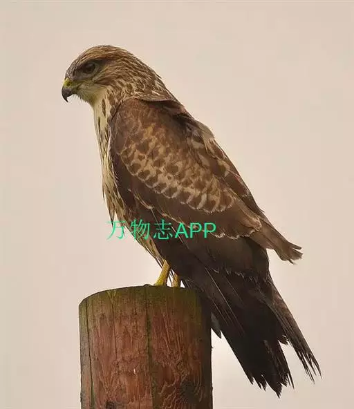 普通鵟(学名:Buteo buteo)属中型猛禽,体长50-59厘米。体色变化较大,上体主要为暗褐色,下体主要为暗褐色或淡褐色,具深棕色横斑或纵纹,尾淡灰褐色,具多道暗色横斑。飞翔时两翼宽阔,初级飞羽基部有明显的白斑,翼下白色,仅翼尖、翼角和飞羽外缘黑色 (淡色型)或全为黑褐色 (暗色型),尾散开呈扇形。翱翔时两翅微向上举成浅‘V’字形。