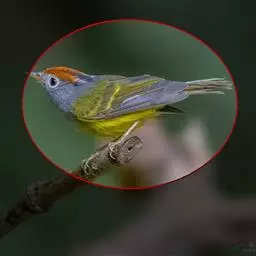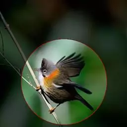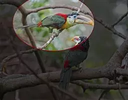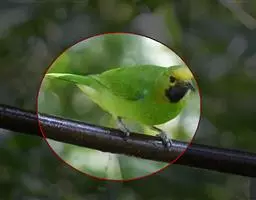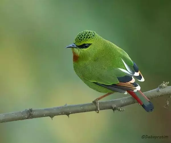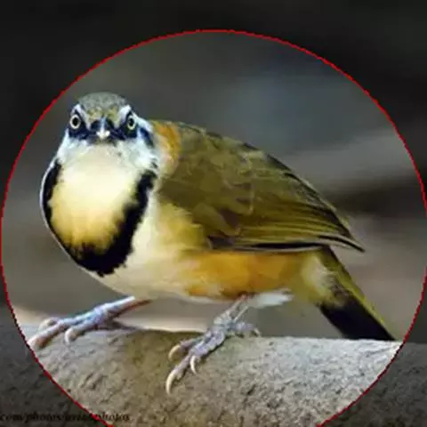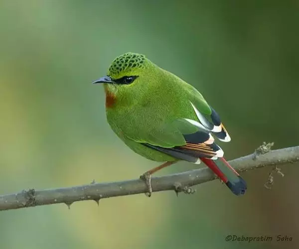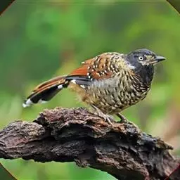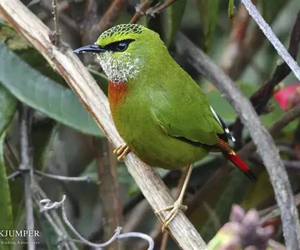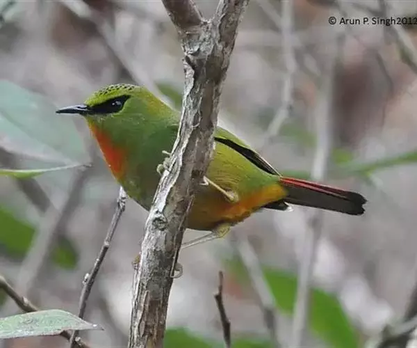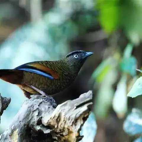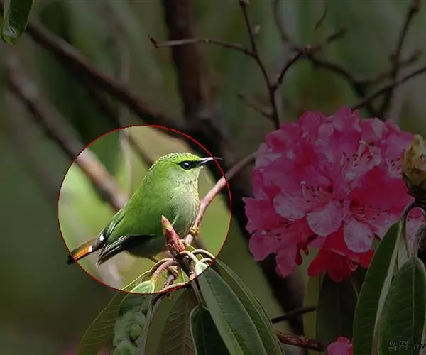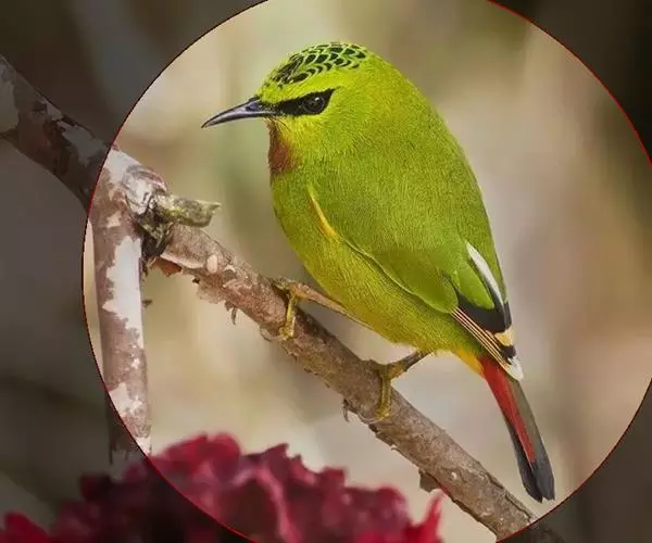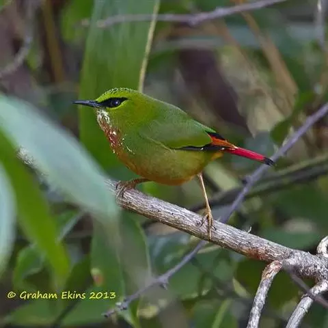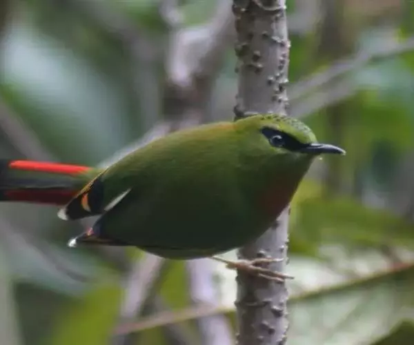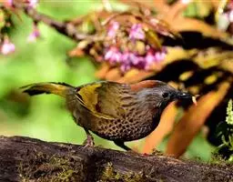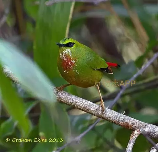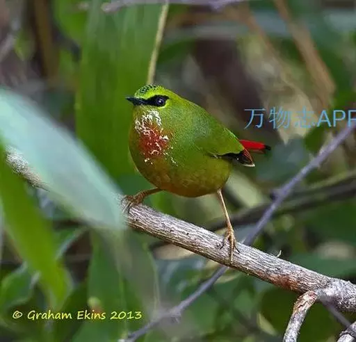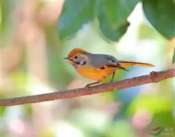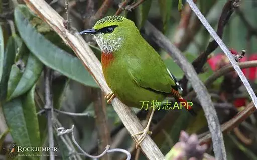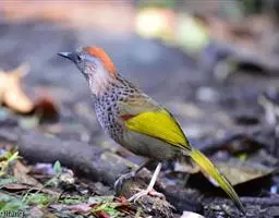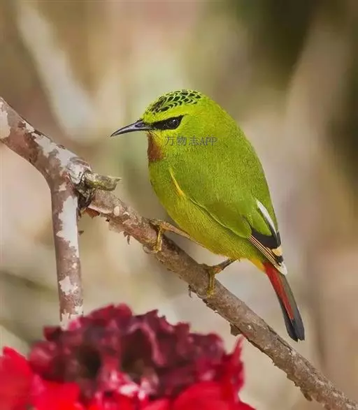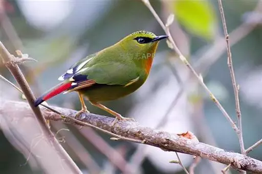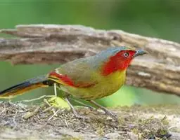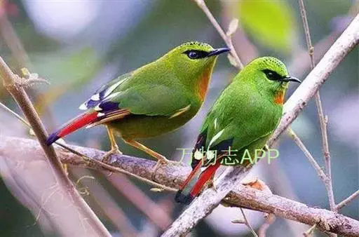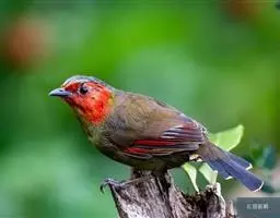 火尾绿鹛(图2) 雄性成鸟:体色一般为有光泽的橄榄黄色,眼先和眼后黑色,眉纹黄绿色;头顶羽毛中央有卵圆形黑斑,构成鳞片状的斑纹;翅上覆羽和尾上覆羽与背部相似,均为橄榄黄色;初级飞羽褐色,外翈深黑色,从第三或第四枚起,端部边缘浅肉黄色,内翈顶端白色;外侧次级飞羽褐色,外翈边缘暗朱红色,向端部渐变为橘黄色和白色,构成朱红色翼镜,最内侧次级飞羽内翈绿色,类似背部,外翈黑色;尾羽暗灰色,顶端微黑色,外翈红色,中央一对尾羽内翈绿色;喉和上胸棕红色;腹部和尾下覆羽棕黄色。 雌性成鸟:与雄鸟相似,但各部羽色较雄体暗些;头顶和背部橄榄绿色;翼镜不为朱红色,而是面积较小的褐黄色;其他各羽片颜色都较雄鸟淡些;翅端白色也较雄鸟面积小;喉部和尾下覆羽淡褐色;下体余部暗绿色微沾黄色。 虹膜红色或红褐色;嘴黑褐色;跗踱肉红色。
