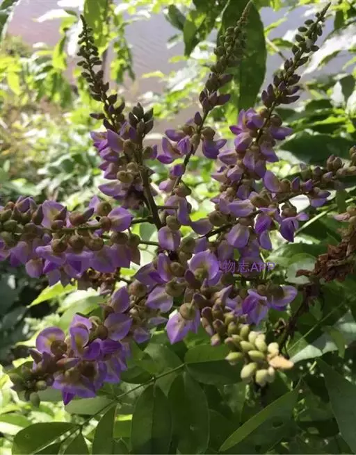 总状花序生于当年生枝的枝梢,同一枝上的花几同时开放,下部枝的叶先开展,花序长30-90厘米,径5-7厘米,自下而上顺序开花;花序轴密生白色短毛;苞片披针形,早落,花长1.5-2厘米;花梗细,长1.5-2.5厘米;花萼杯状,长4-5毫米,宽5-6毫米,与花梗同被密绢毛,上方2萼齿甚钝,圆头,下方3齿锐尖,最下1齿甚长,长达3毫米;花冠紫色至蓝紫色,旗瓣圆形,先端圆,基部略作心形,翼瓣狭长圆形,基部截平,具小尖角,龙骨瓣较阔,近镰形,先端圆钝;子房线形,密被绒毛,花柱上弯,无毛,胚珠8粒。荚果倒披针形,长12-19厘米,宽1.5-2厘米,平坦,密被绒毛,有种子3-6粒;种子紫褐色,具光泽,圆形,径1-1.4厘米。花期4月下旬至5月中旬,果期5-7月,荚果宿存枝端。