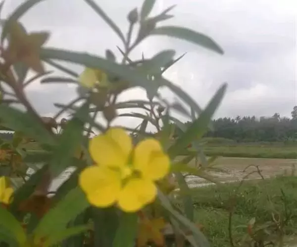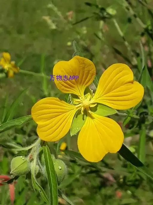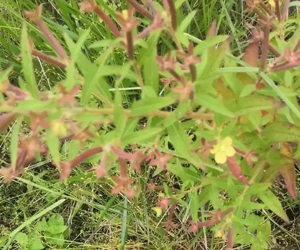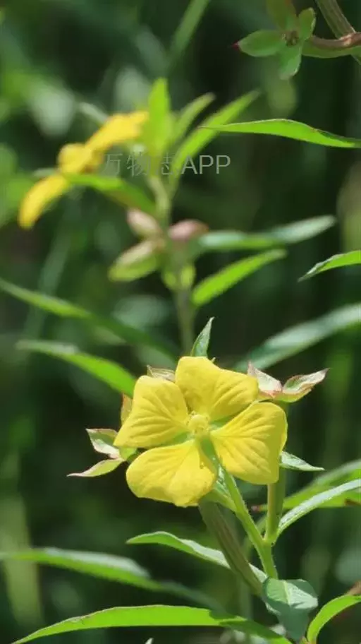 亚灌木状草本,高0.3-1m。茎直立,稍具纵棱,幼时绿色,老时变红色,茎上部中空,全株被柔毛。叶互生;几无柄;叶片披针形或条状披针形,长3-15cm,宽1-2.5cm,先端渐尖,基部渐狭,全缘,两面密被柔毛。花两性,单生于叶腋,近无梗;萼筒线形,萼片4,长卵形,长6-15mm,具3脉,宿存;花瓣4,黄色,倒卵形,先端微凹,具4对明显脉纹,长8-10mm;雄蕊8;子房下位,柱头头状。蒴果圆柱形,绿色或淡紫色,长2-5cm,直径约5mm,被毛,具棱,棱间开裂;种子多数,近半球形,种脊明显。花期7-10月。