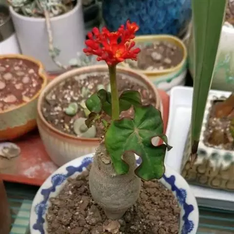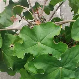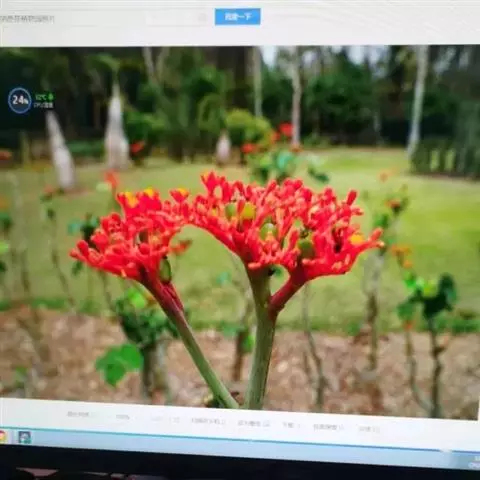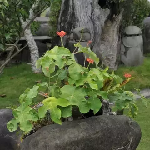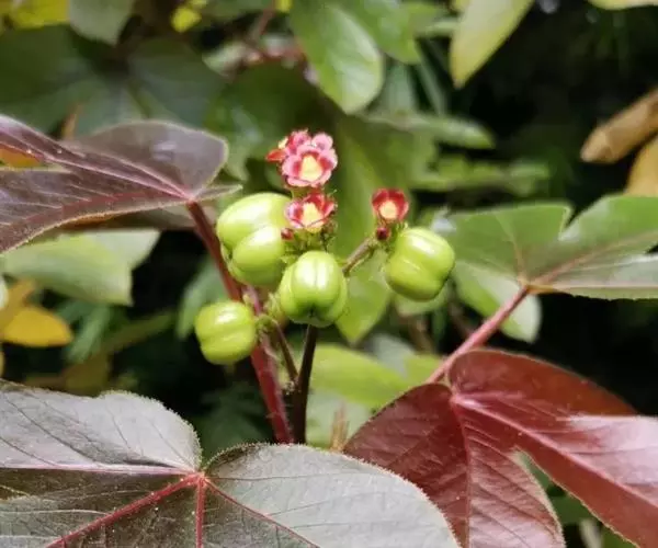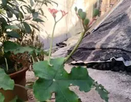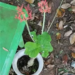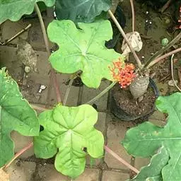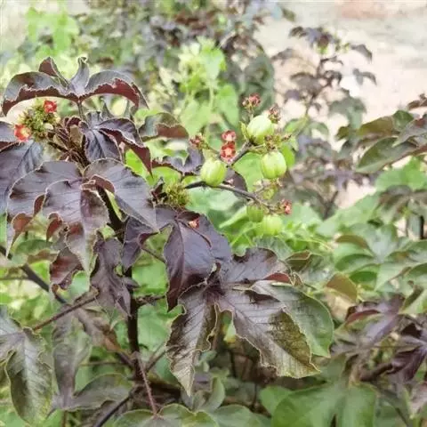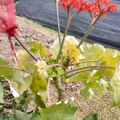 棉叶珊瑚花 (拉丁学名:Jatropha gossypiifolia Linn.)别名:红叶麻风树、棉叶麻风树、棉叶膏桐、棉叶木花生。为双子叶植物纲、大戟科、麻疯树属多年生落叶灌木或小乔木,株高2~6米。树皮光滑,苍白色;具乳汁,无毛。全株有毒。