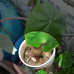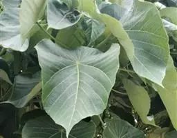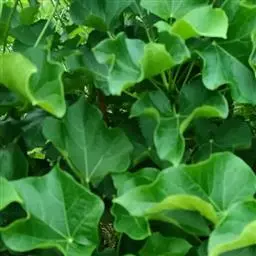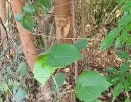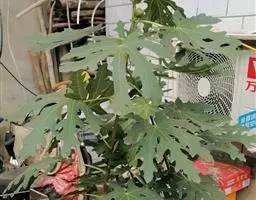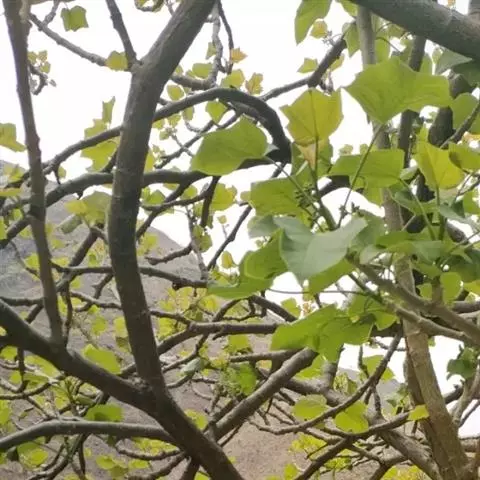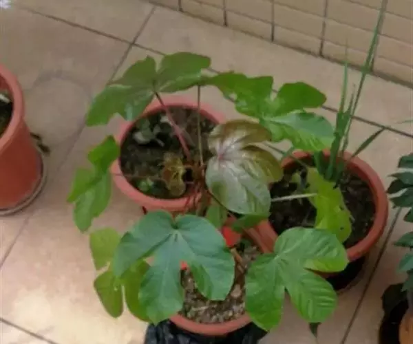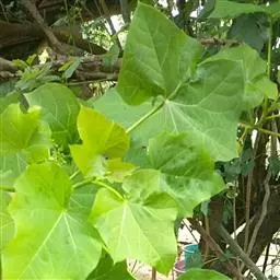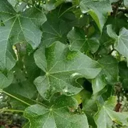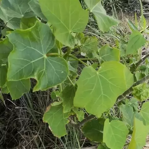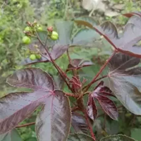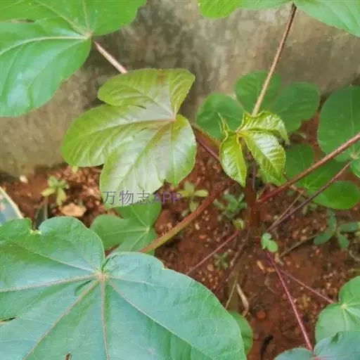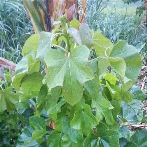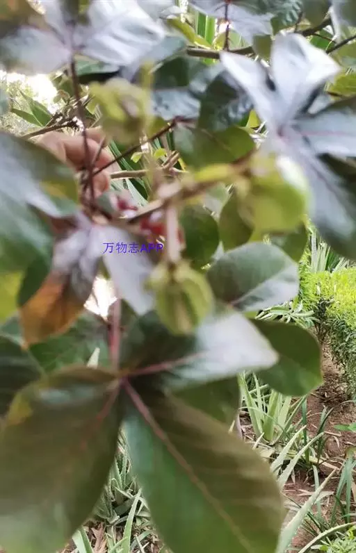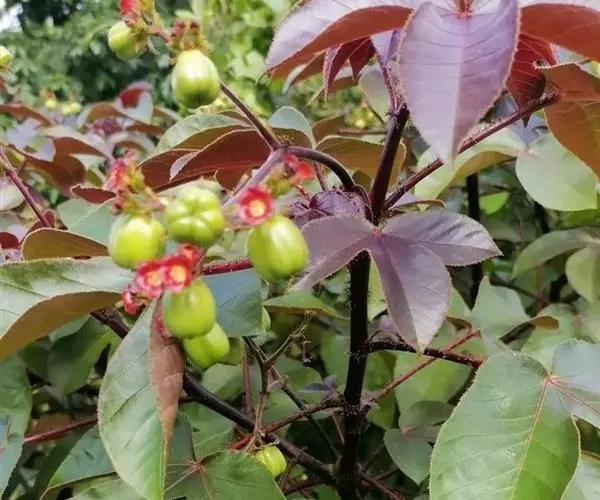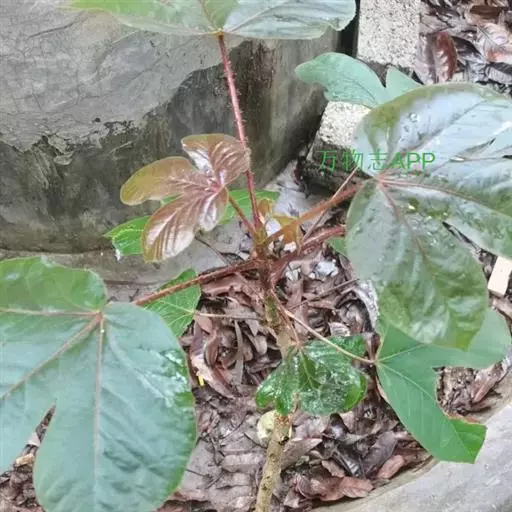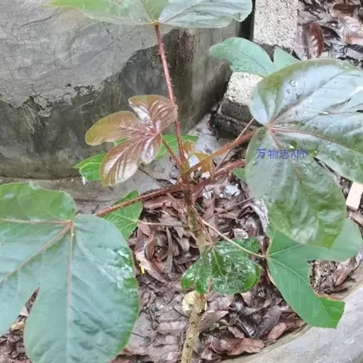 多年生落叶灌木或小乔木,株高2~6米。树皮光滑,苍白色;具乳汁,无毛。全株有毒。嫩叶紫红色,渐变绿色;叶背紫红色。单叶互生,近革质,掌状深裂3或4,裂片线状披针形或羽状,叶缘具锯齿,叶柄长10~25厘米,具刚毛,紫红色;托叶细裂为刚毛状,长约2厘米。