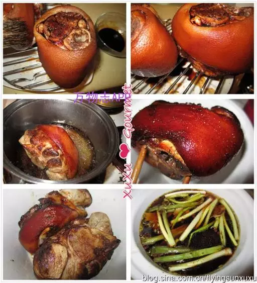 油炸:选用产地范围内的菜籽油,将油温加热到180℃至200℃,调煮好的肘子油炸40秒至1分钟,至其表面呈金黄色后,捞出速入冷水,表皮激出均匀的皱纹状。