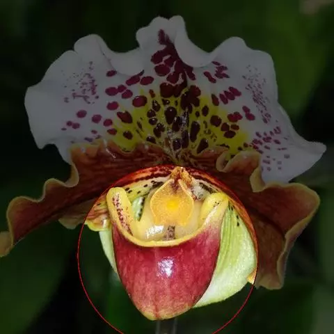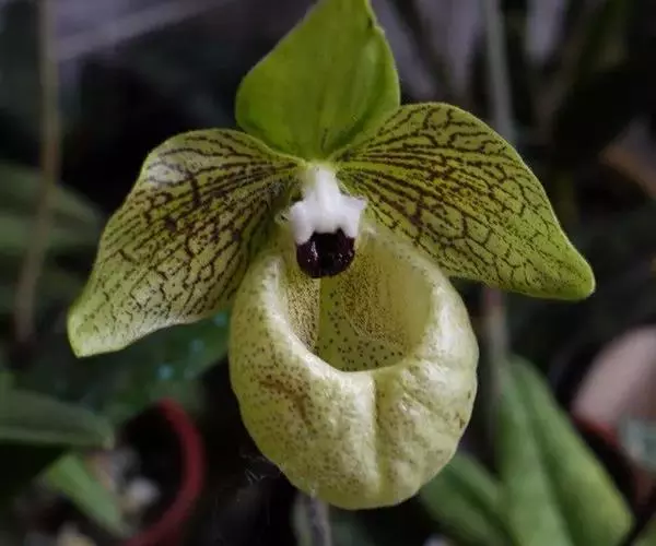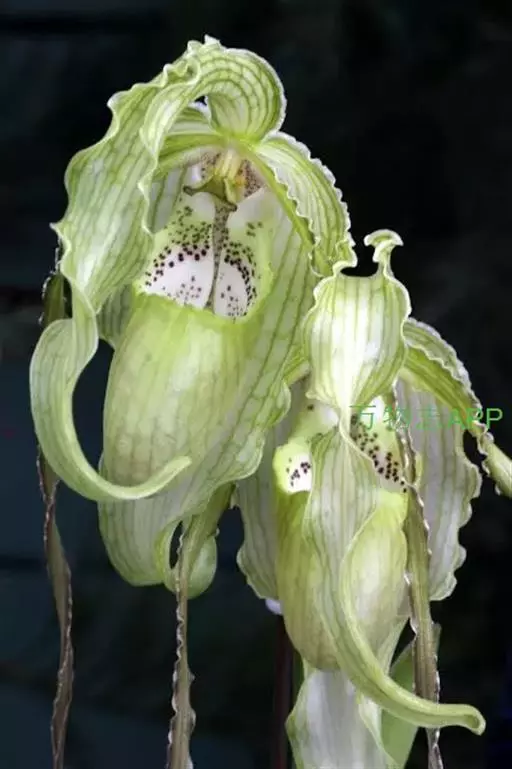 花葶直立,长(26-)30-40厘米,紫色,具锈色长柔毛,中部常有1枚不育苞片,顶端生1花;花苞片狭卵状披针形,长2-4厘米,绿色并具紫色斑点,背面被疏柔毛,边缘有缘毛;花梗和子房长3.5-4.5厘米,具长柔毛;花直径8-9厘米,黄绿色或淡绿色,花瓣上有紫褐色条纹或多少由斑点组成的条纹,唇瓣上有时有不甚明显的紫褐色斑点,退化雄蕊白色而近先端有深紫色斑块,较少斑块完全消失;中萼片椭圆状披针形,长3.5-4.5厘米,宽1.8-2.5厘米,先端渐尖或长渐尖,内表面疏被微柔毛,背面具长柔毛,边缘有缘毛;合萼片卵状披针形,长3.5-4.5厘米,宽2-2.5厘米,先端略2齿裂,内表面疏被微柔毛,背面具长柔毛并有不甚明显2条龙骨状突起,边缘亦具缘毛;花瓣倒卵形、卵形或椭圆形,长4-5厘米,宽2.5-3厘米,先端急尖或钝,两面被微柔毛,内表面基部有长柔毛,边缘具缘毛;唇瓣深囊状,近球形,长与宽各4-4.5厘米,囊口近圆形,整个边缘内折,囊底有长柔毛;退化雄蕊长圆状卵形,长达1.3厘米,宽1.1厘米,先端截形,基部近无柄,基部边缘有细缘毛,背面有龙骨状突起,上表面有4个脐状隆起,其中2个近顶端,另2个近基部。花期12月至次年3月。