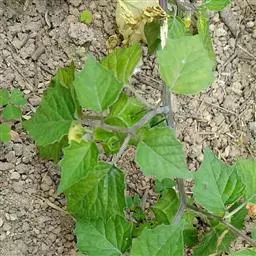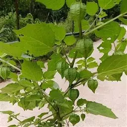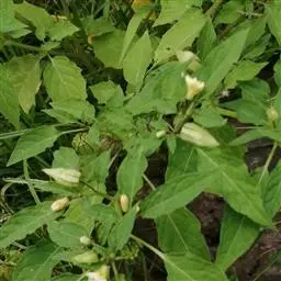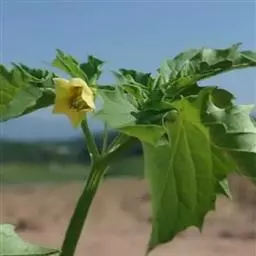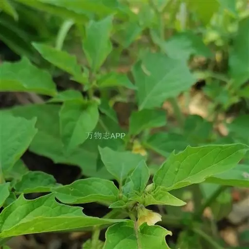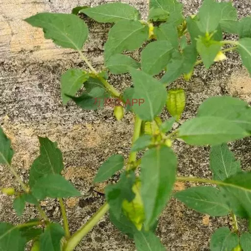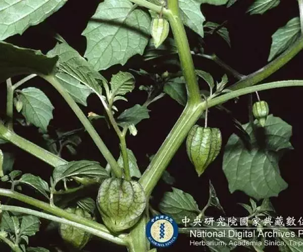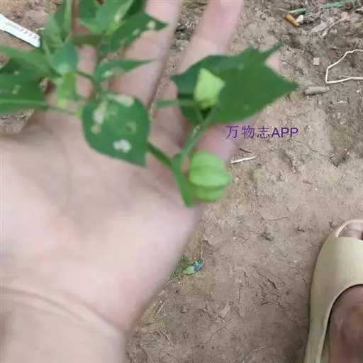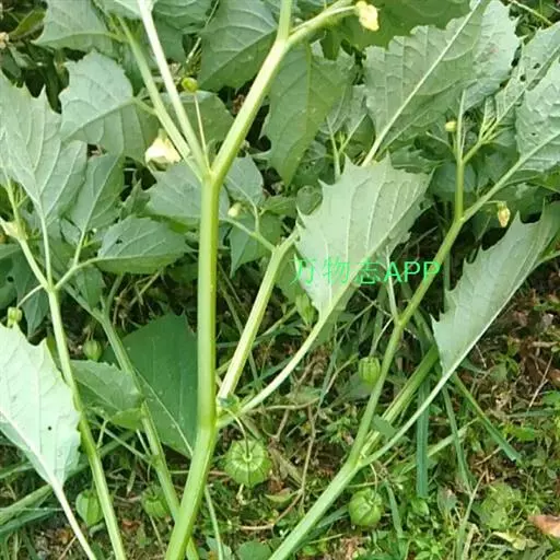 茎有分枝,具细柔毛或近光滑,叶互生,黄绿色,多皱缩或脱落,完整者卵形,长3-6cm,宽2-4cm(用水泡开后展平),先端渐尖,基部偏斜,全缘或有疏锯齿,厚纸质;叶柄1-3cm。花淡黄棕色,钟形,先端5裂。有的可见果实,球形,橙红色,外包淡绿黄色膨大的宿萼,长约2.5cm,有5条较深的纵棱。气微,味苦。