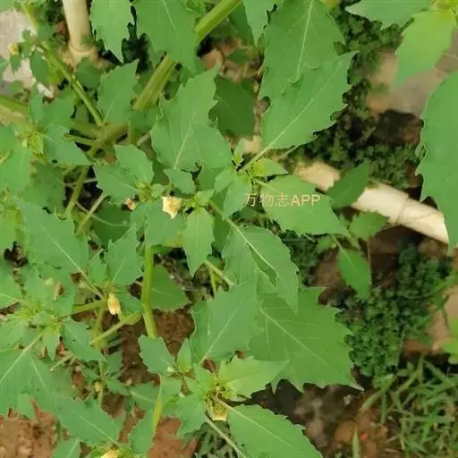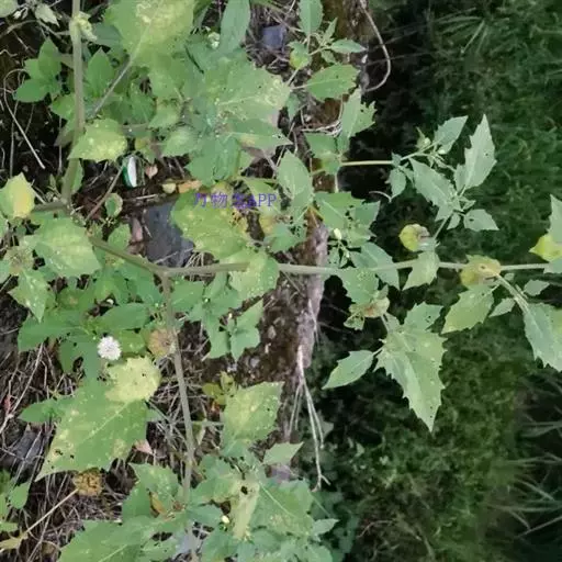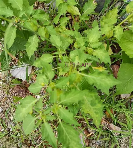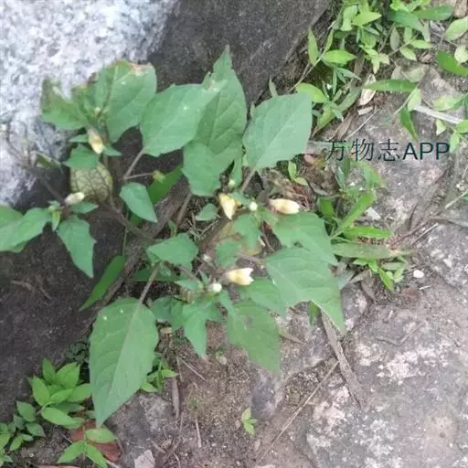 一年生草本,被疏短柔毛或近无毛,高常30-50厘米;茎多分枝,分枝纤细。叶柄长1-5厘米,叶片卵形至卵状椭圆形,顶端渐尖或急尖,基部阔楔形或楔形,全缘或有不等大的牙齿,两面近无毛,长3-6厘米,宽2-4厘米。花梗长约5-12毫米,纤细和花萼一样生短柔毛,长4-5毫米,5中裂,裂片披针形,生缘毛;花冠淡黄色,喉部常有紫色斑纹,长4-6毫米,直径6-8毫米;花药蓝紫色或有时黄色,长约1.5毫米。果萼卵球状,直径1.5-2.5厘米,薄纸质,浆果直径约1.2厘米。种子圆盘状,长约2毫米。花果期5-12月。