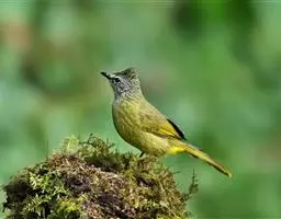 黄绿鹎(学名:Pycnonotus flavescens),小型鸟类,体长19-22厘米。额至头顶暗褐具灰色羽缘,眼先黑色,其上面有一粗著的白纹从鼻后至眼,在黑色的头部极为醒目。上体橄榄绿褐色。颏、喉淡灰色或灰白色,胸灰褐色具橄榄黄色羽缘,尾下覆羽鲜黄色。明显与其他鹎不同,野外不难鉴别。